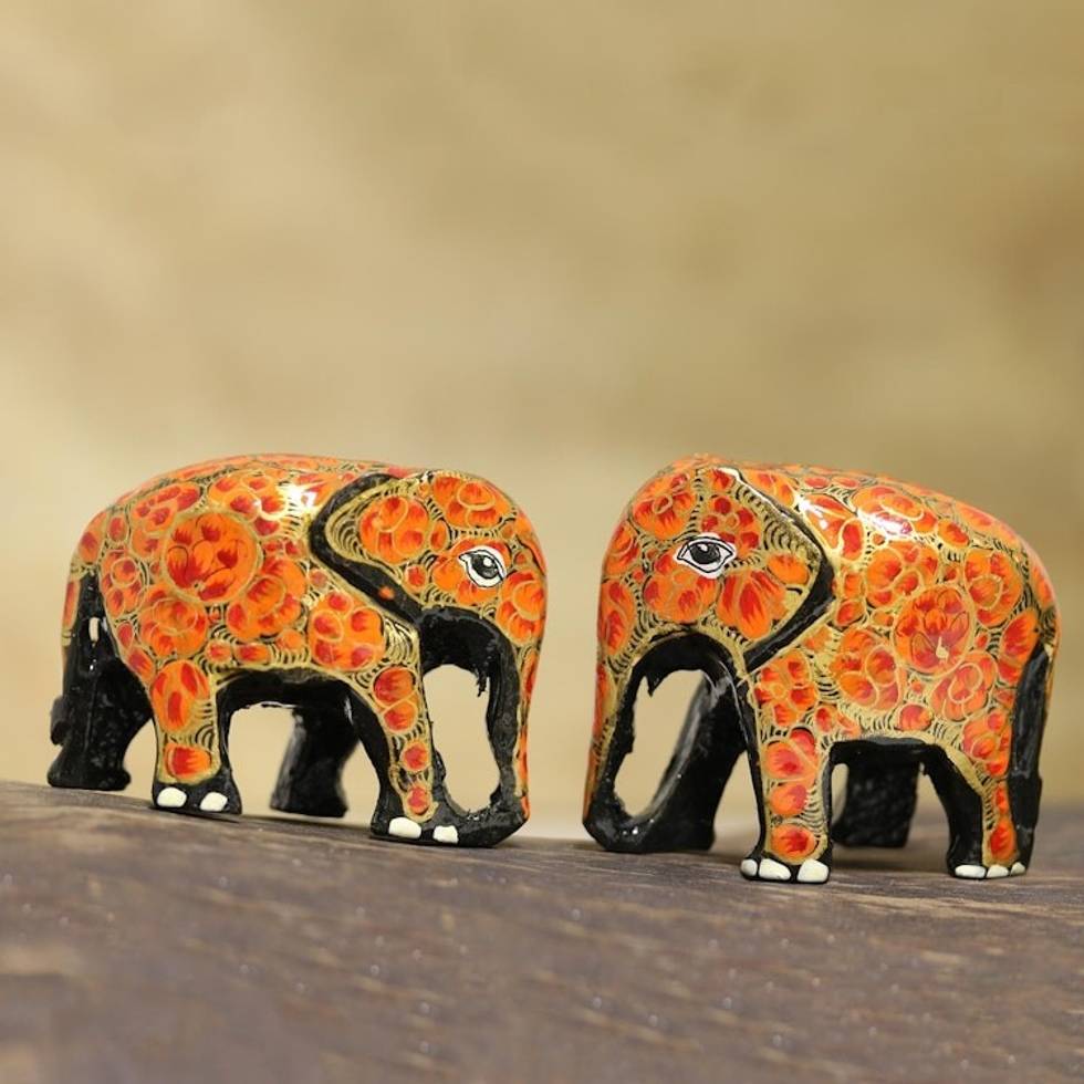 Hand Painted papier Mache Elephants pair 'Orange Flower Friends' Item ID: 2671625636