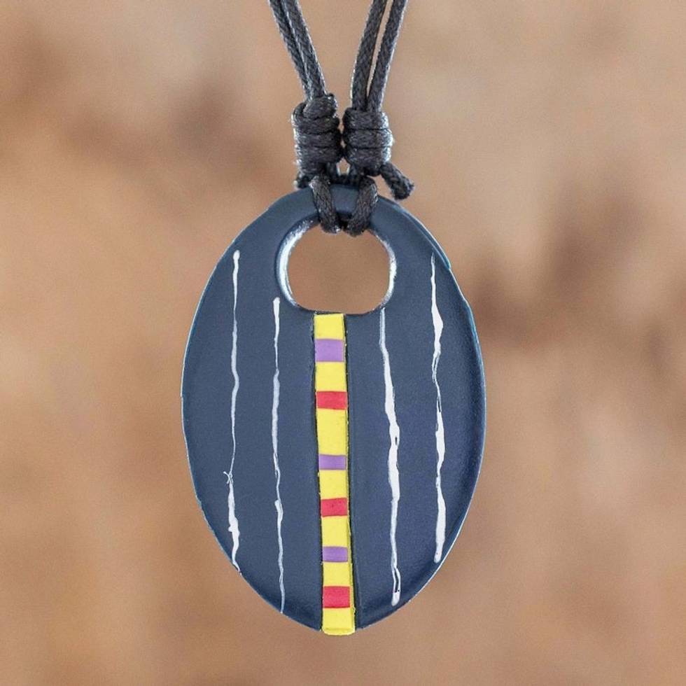 "This original pendant necklace is the design of Patty de Zea in Guatemala. She crafts the pendant from cold porcelain and paints it by hand in black and white with a colorful stripe down the middle. The pendant centers a waxed black cotton cord of adjustable length."