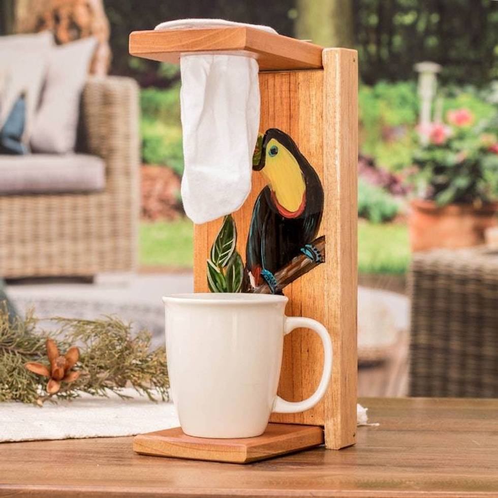 Hand-Painted Pinewood Toucan Single-Serve Drip Coffee Stand 'Coffee with Toucans' Item ID: 2676659545