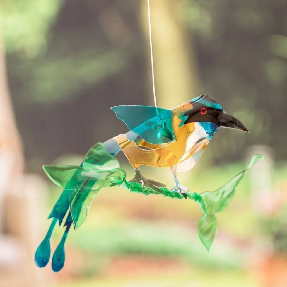 "Costa Rica's Karolyn Cruz chooses a palette of refreshing hues to create a tropical mobile from recycled plastic. After painting each detail with dedication, the artisan creates an eco-friendly home accent with a shiny Amazonian motmo bird dangling gracefully at the bottom of the work. The accessory also comes with a little brass jingle bell and a galvanized hook for easy use."