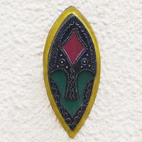 "Plated in silvery aluminum, Habib Mustapha's textured wall mask makes quite an impression. The Ghanaian artisan hand carves the elongated mask from local sese wood before plating the cheeks, forehead, nose, and chin in patterned aluminum. A trio of bright hues finishes the mask with a pop of color."