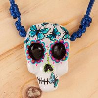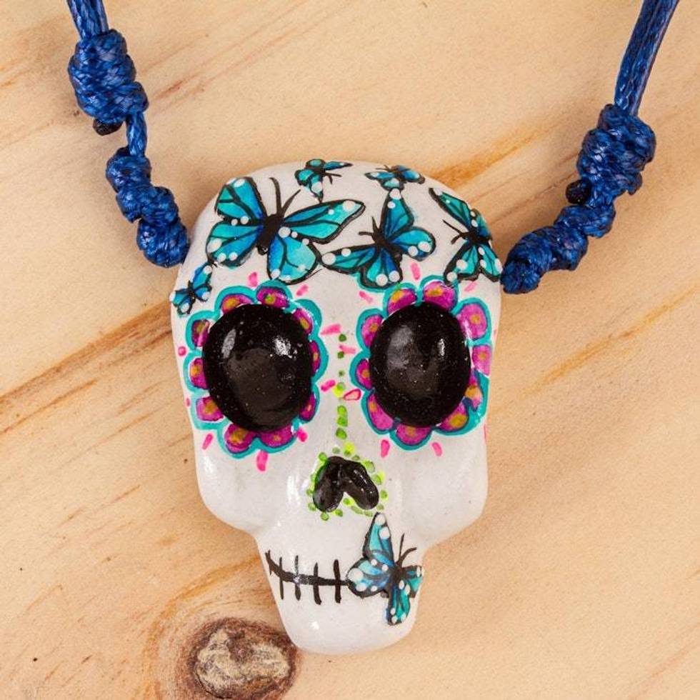 Hand Painted Skull Necklace with Butterflies 'Blue Butterfly Calavera' Item ID: 2675229791