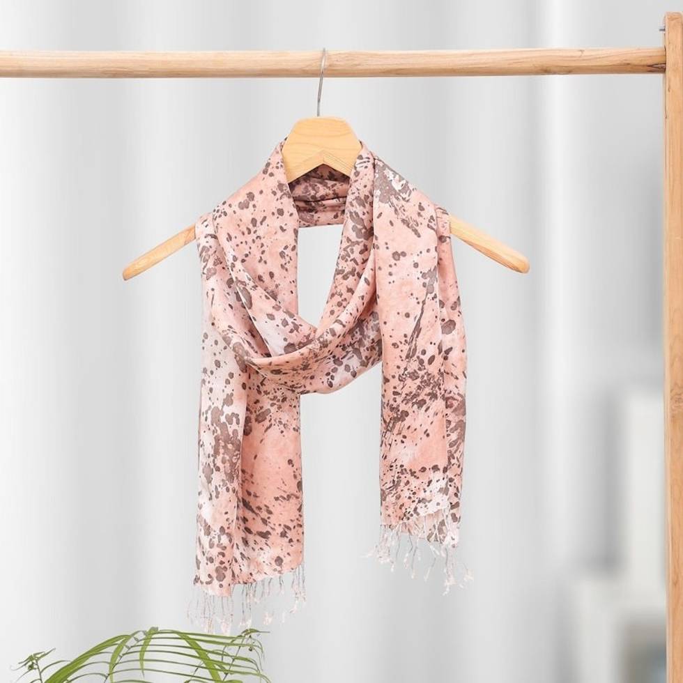 "Hand-painted with a charming speckled motif, Nutcharath's lightweight scarf is truly one-of-a-kind. The Thai artisan crafts the scarf from airy silk, using eco-friendly dyes to paint the fabric in versatile chestnut brown."