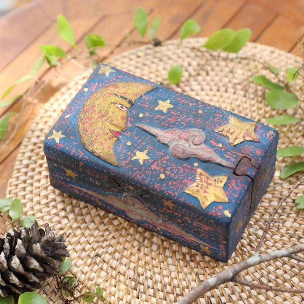"The night attracts all kinds of magical and fantastic elements that make life an enchanting dream. Inspired by the moon and stars that illuminate the Balinese nights, artisan Anak Agung Ary presents a decorative box made from suar wood, all painted by hand for a charming vibe. On top of that, the item comes with a polyester velvet lining."
