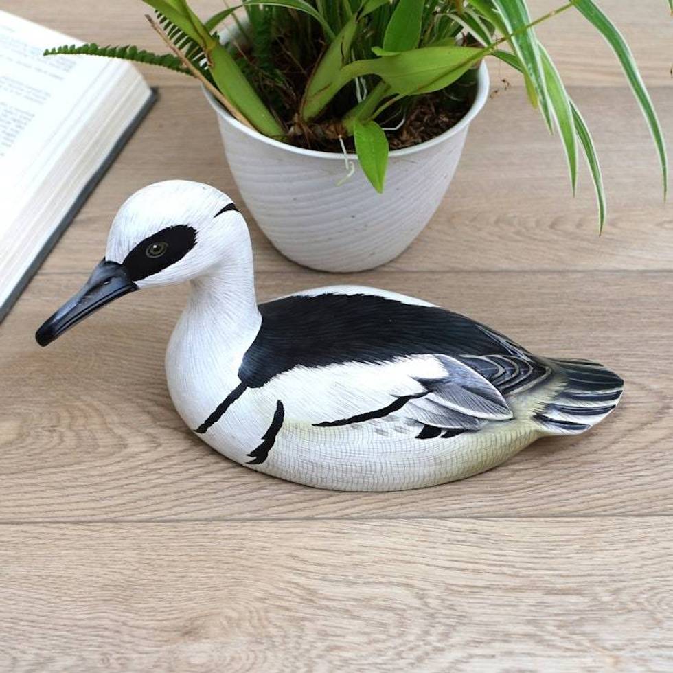 Hand-Painted Suar Wood Duck Statuette 'White Smew' Item ID: 2676667706
