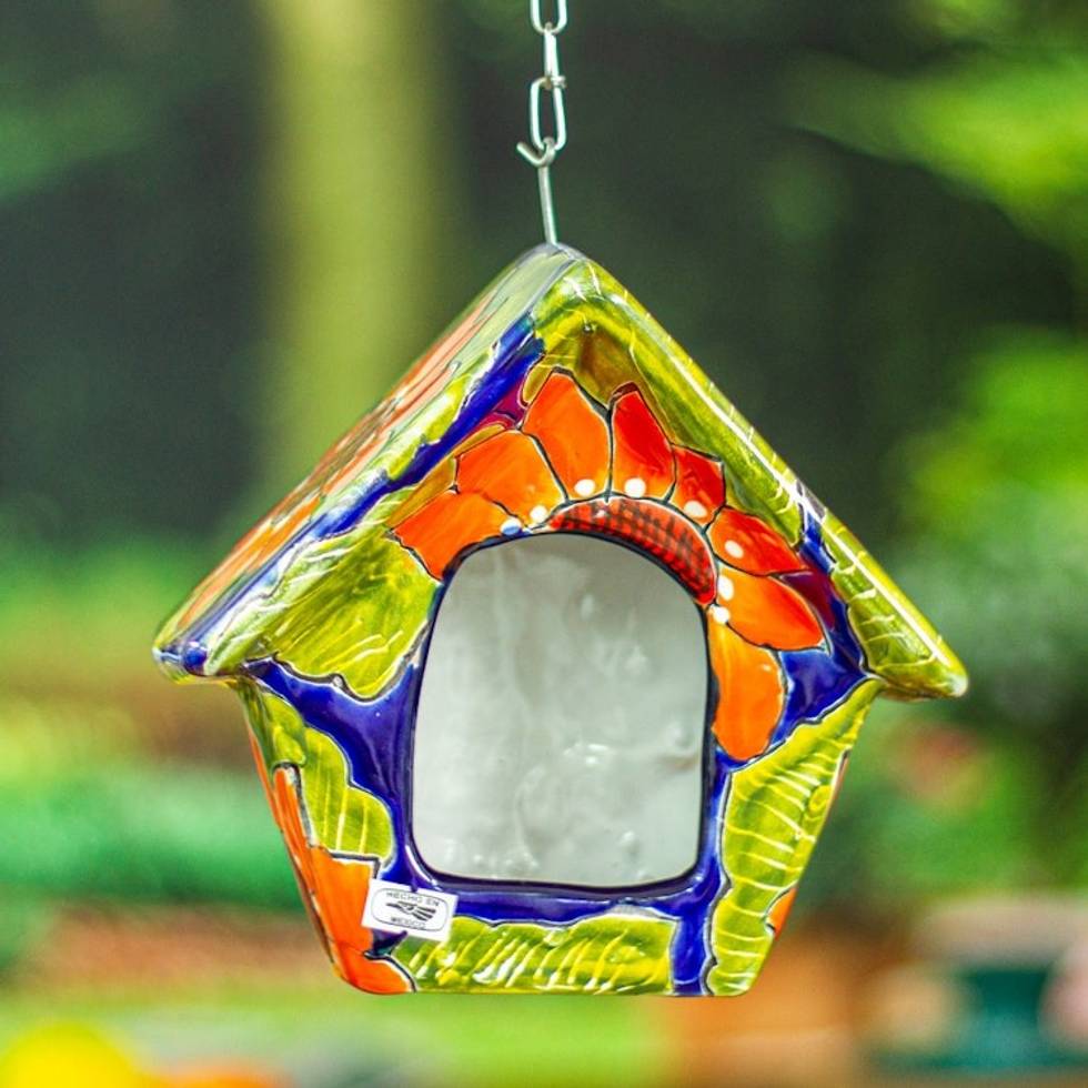 Hand-Painted Talavera Ceramic Bird Feeder in Green and Blue 'Lime Arcadia' Item ID: 2671807371