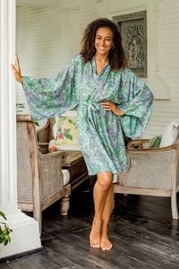 Hand-Painted Tie-Dye Rayon Robe 'Green Gardens' Item ID: 2671476026