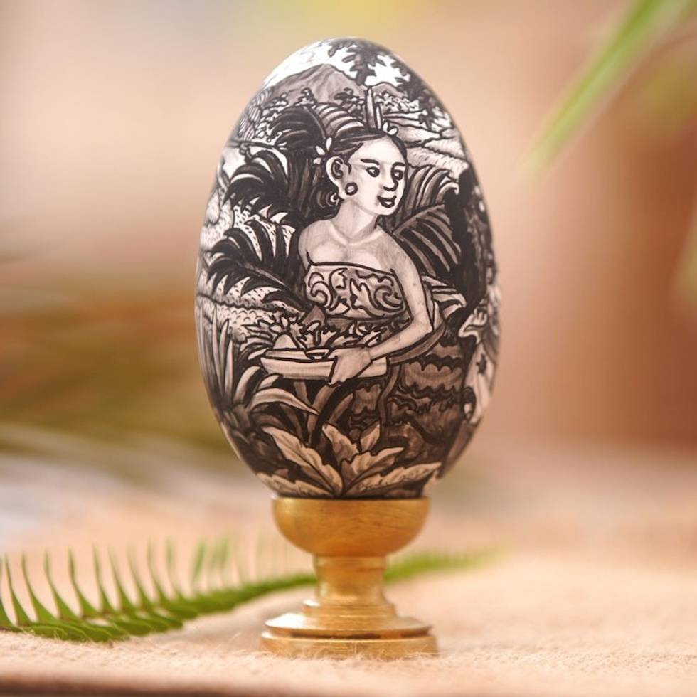 "Crafted from albesia wood, this unique egg sculpture is carefully hand-painted by Ketut Bungkling. Using a monochrome palette, he depicts two women performing mebanten, the daily offering made by Balinese Hindus. The sculpture arrives on a golden wooden base."