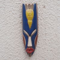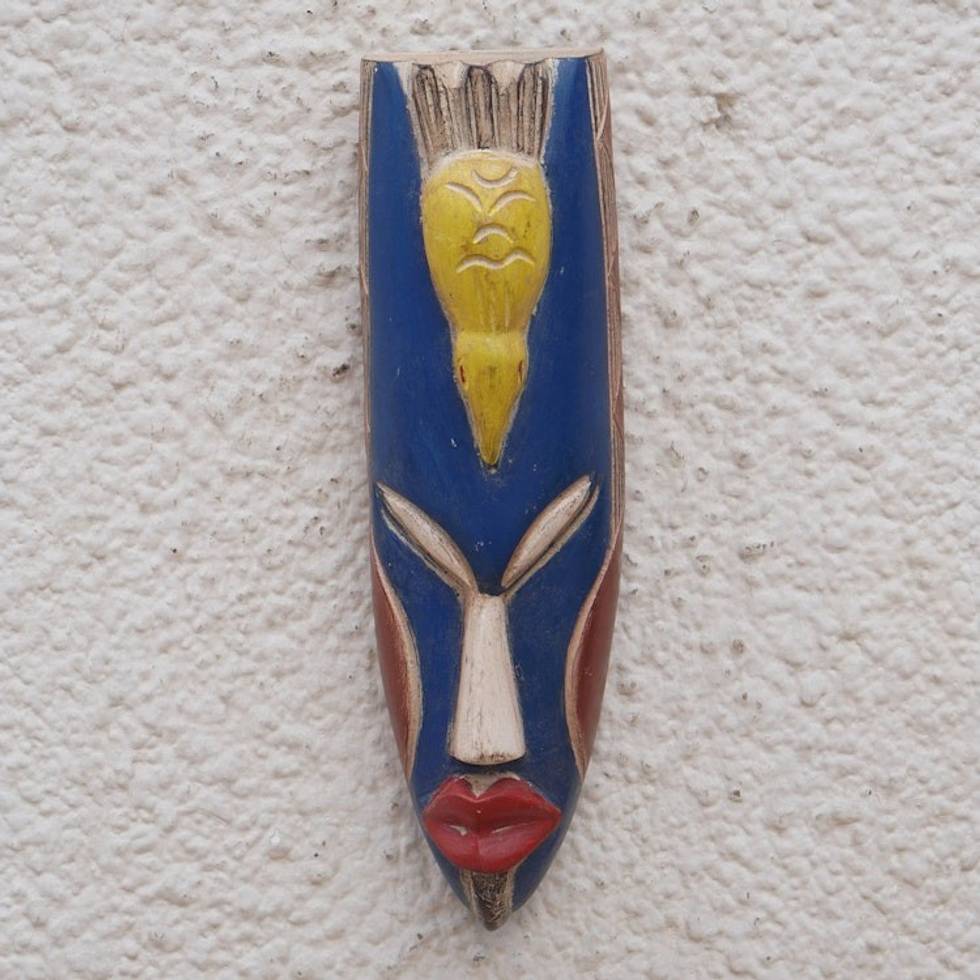 Hand-Painted Yellow and Blue African Mask with Bird Detail 'Tutu Ni Ba' Item ID: 2671805434