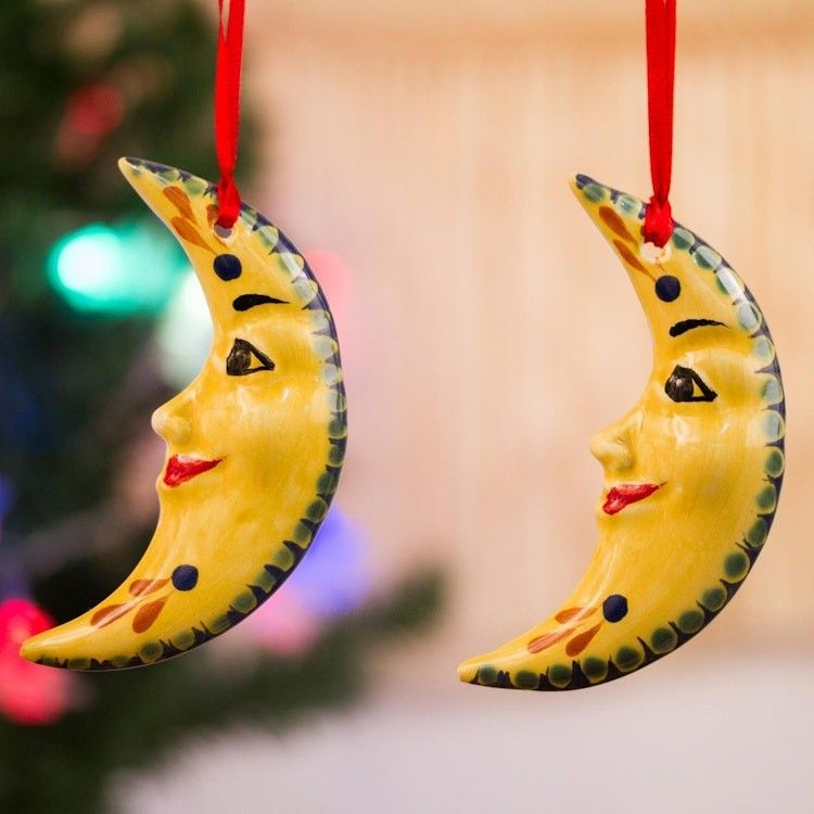 Hand-Painted Yellow Ceramic Moon Ornament Pair 'Bright Moons' Item ID: 2671808806