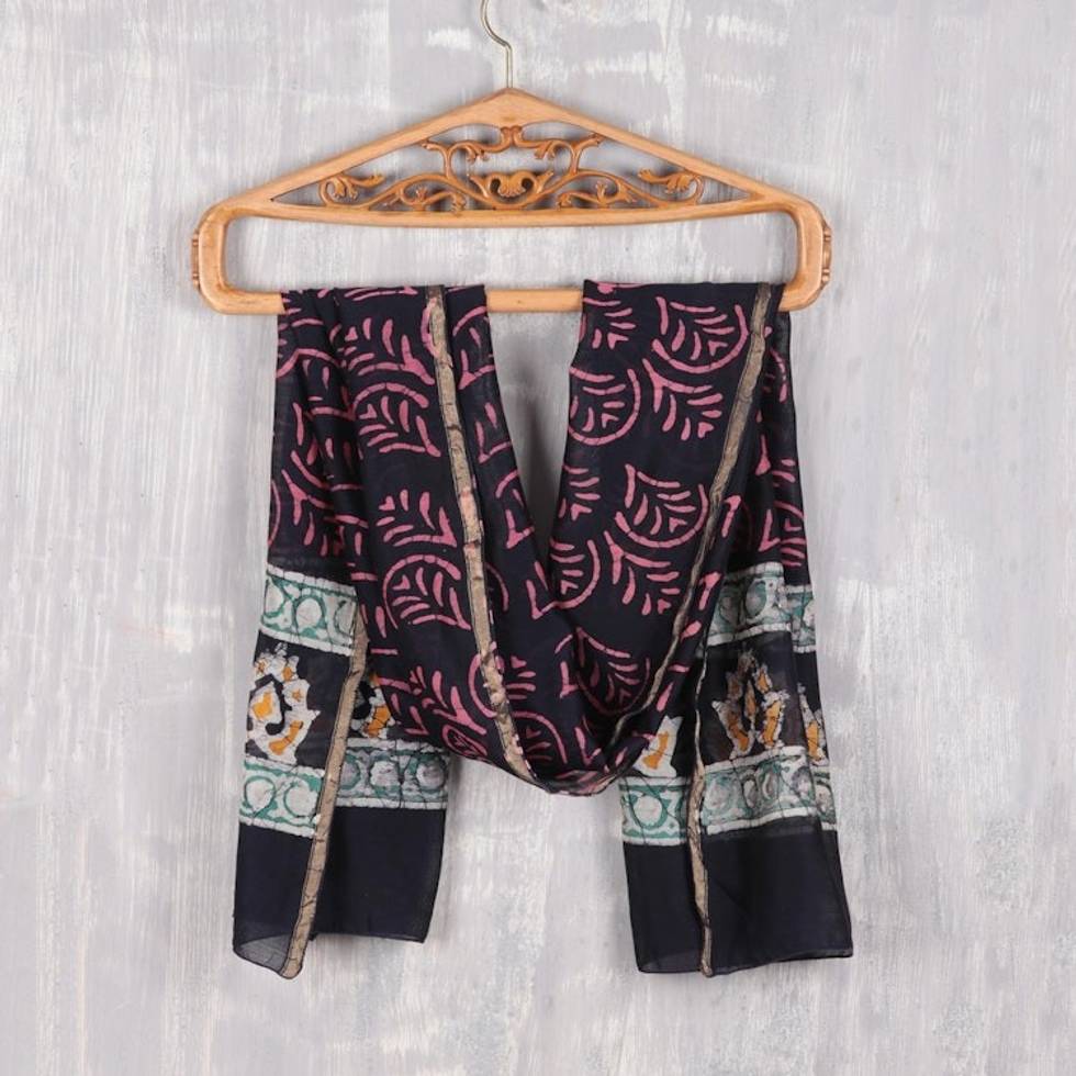 "Using batik techniques, Siddique in India creates this pretty, lightweight shawl. The cotton and silk blend fabric features a stamped pattern in green, rose, and orange on dark navy blue."
