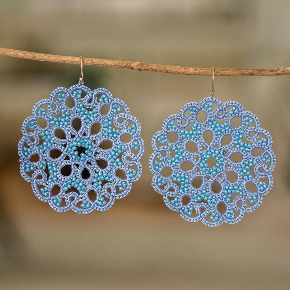 Hand-Tatted Blue Dangle Earrings with Glass Beads 'Life Harmony in Blue' Item ID: 2671771583