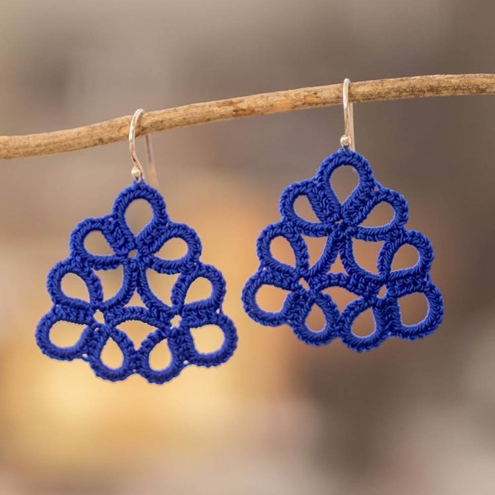 Hand-Tatted Blue Dangle Earrings with Sterling Silver Hooks 'Floral Essence in Blue' Item ID: 2671770172
