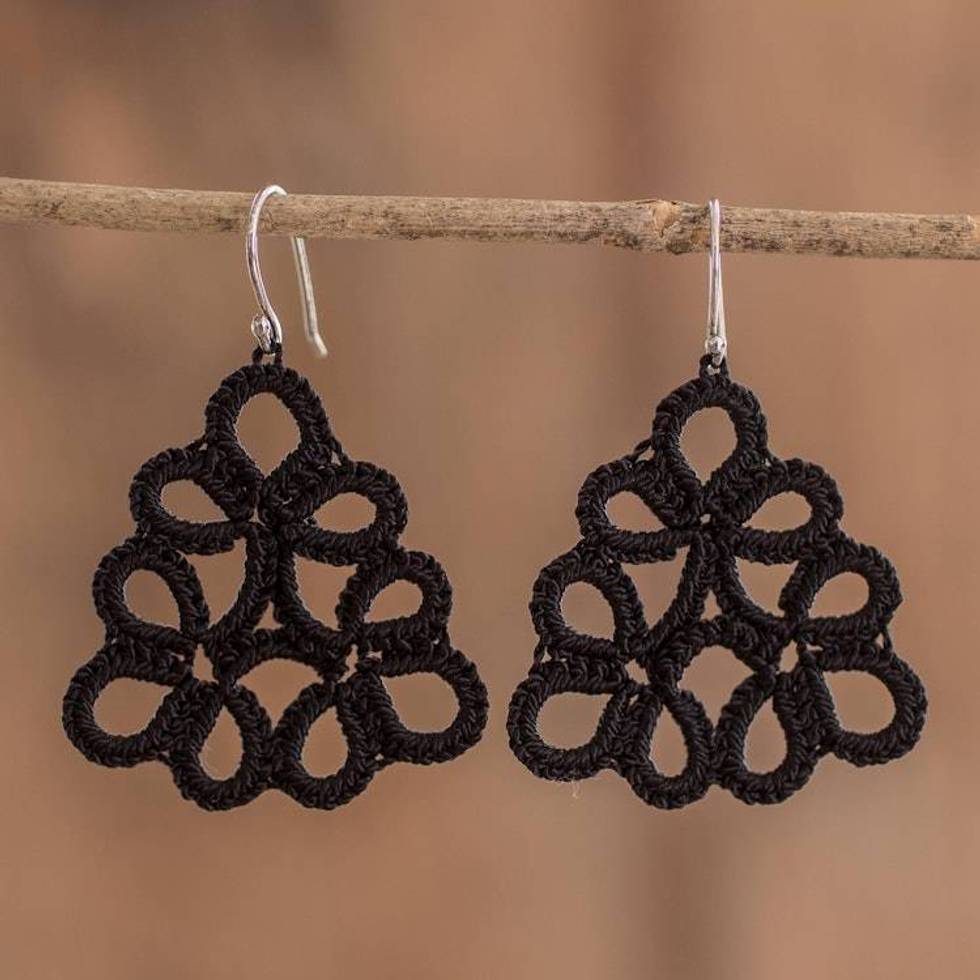 Hand-Tatted Dangle Earrings in Black Crafted in Guatemala 'Petal Essence in Black' Item ID: 2676659505