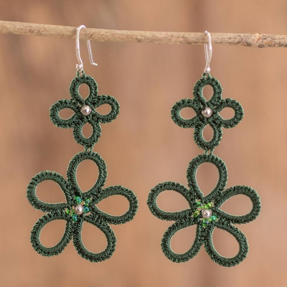 Hand-Tatted Floral Dangle Earrings in Green 'Green Flora' Item ID: 2671771625