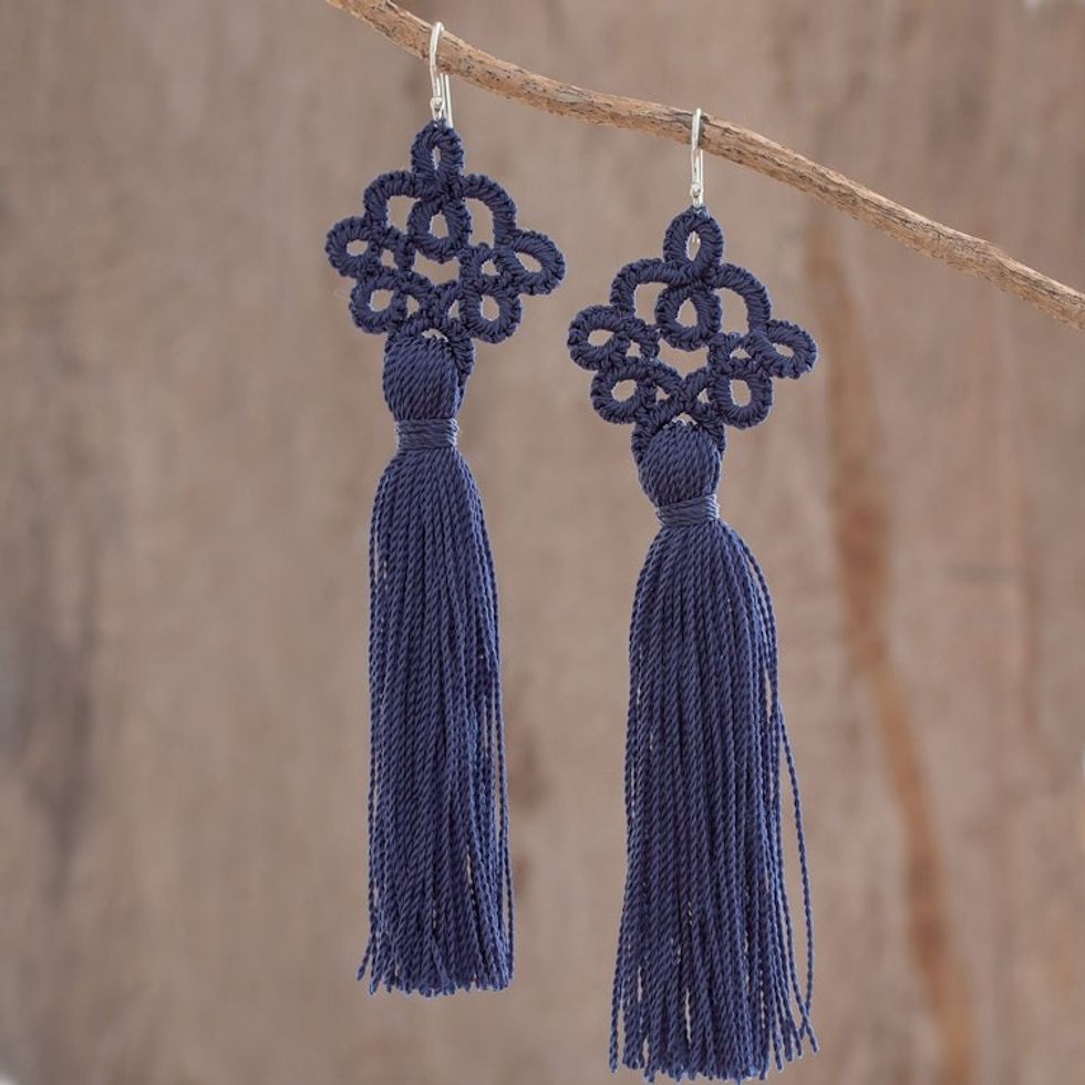 Hand-Tatted Indigo Dangle Earrings from Guatemala 'Antique Details in Indigo' Item ID: 2671776840