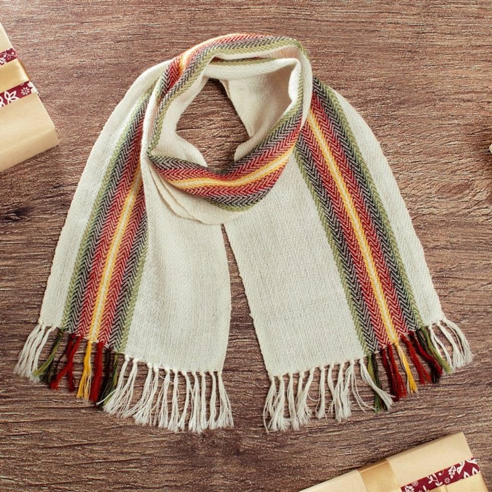 Hand-Woven 100 Alpaca Scarf in Ivory with Colorful Stripes 'Andean Glamor' Item ID: 2671820659