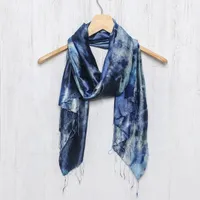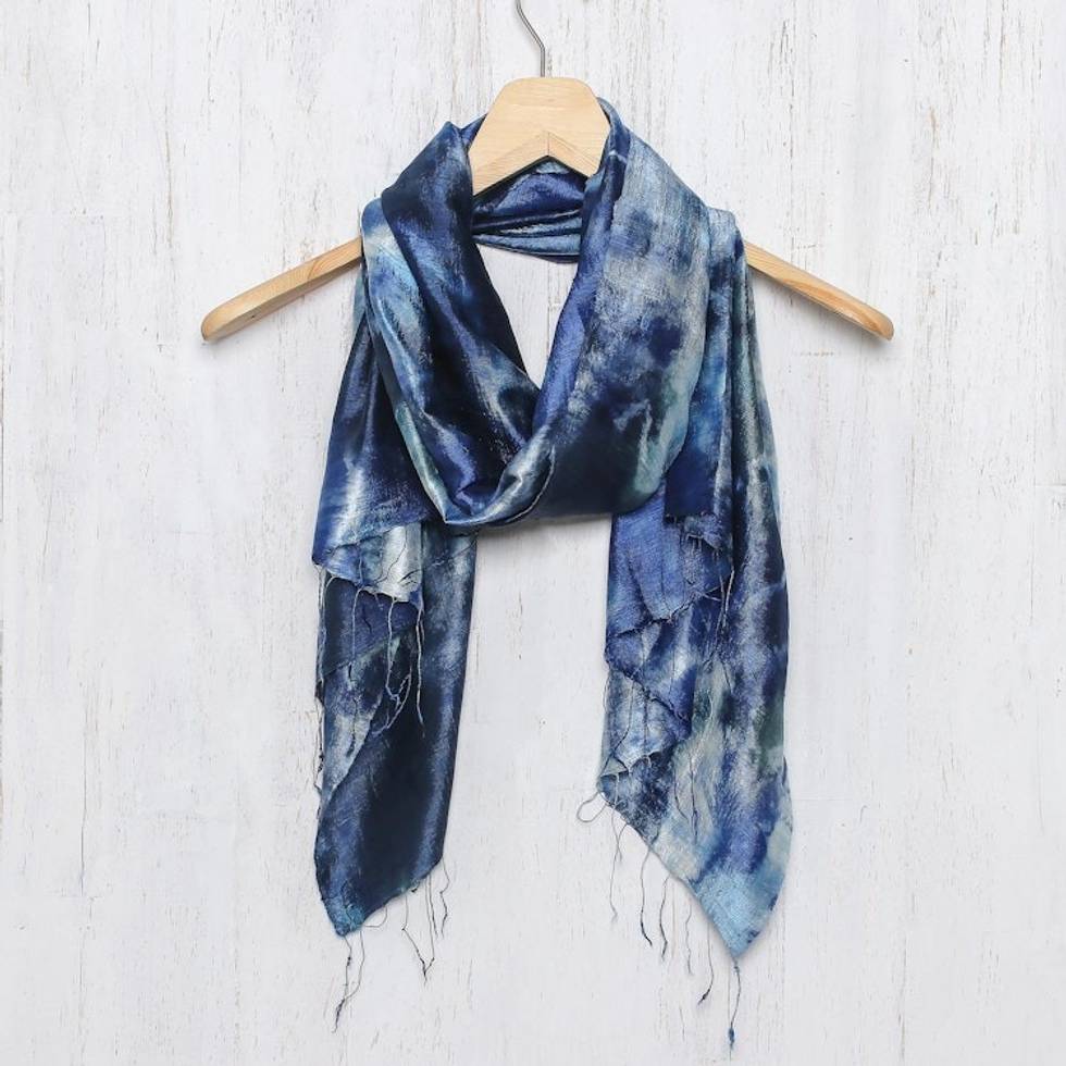 Hand Woven 100 Silk Tie Dye Scarf in Blue from Thailand 'Moving Skies' Item ID: 2669925705