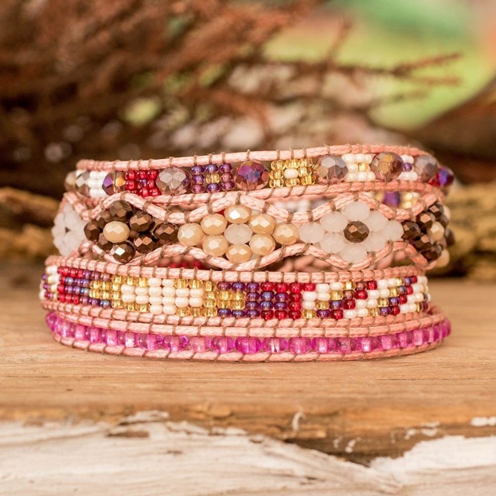 Hand-Woven Beaded Floral Wrap Bracelet with Pewter Button 'Encircling Glam' Item ID: 2671626610