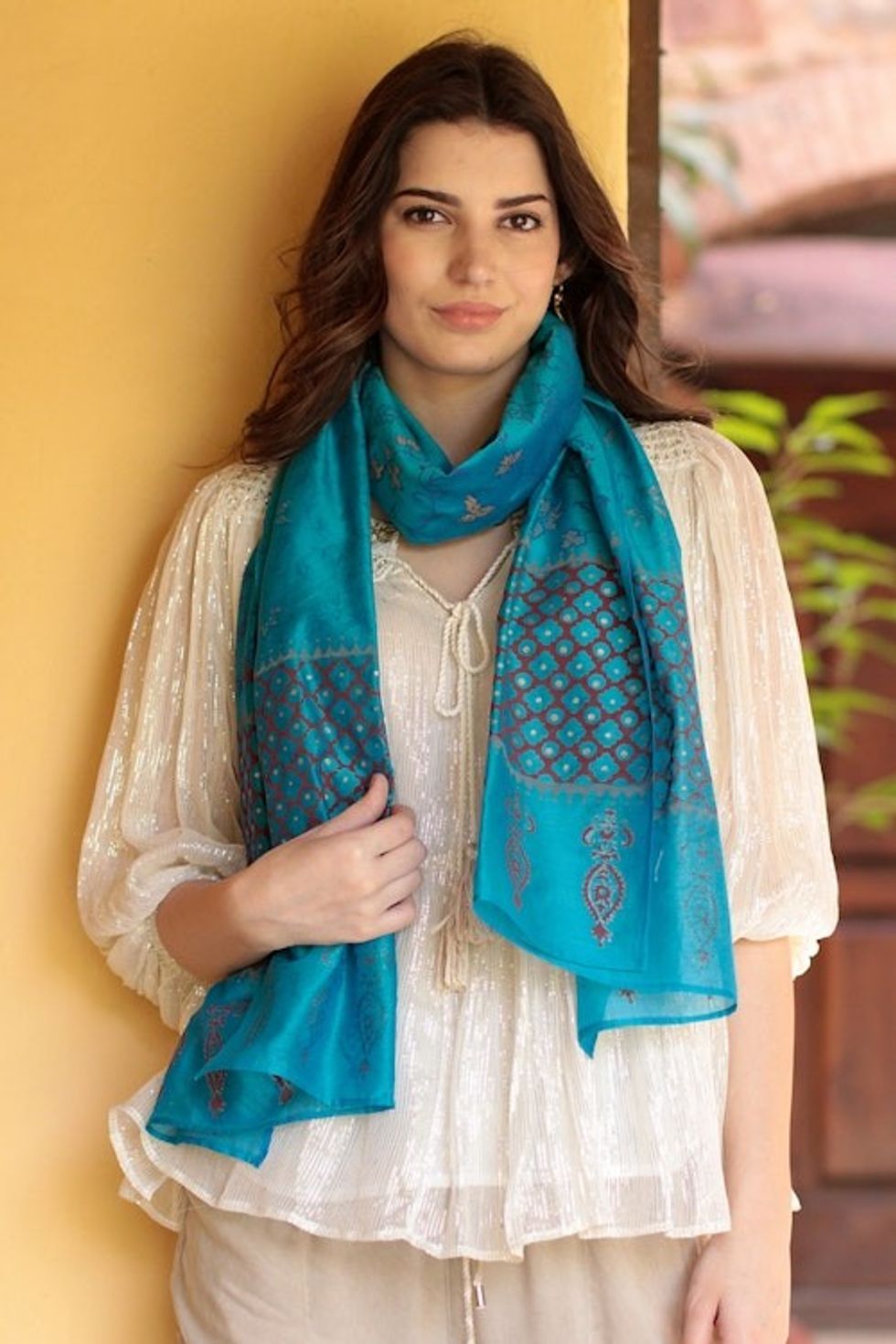 Hand-Woven Cotton and Silk Shawl from India 'Sacred Sea' Item ID: 2671789092