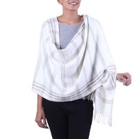 Hand Woven Ivory Wool Blend Striped Shawl from India 'Himalayan Beauty' Item ID: 2671791120