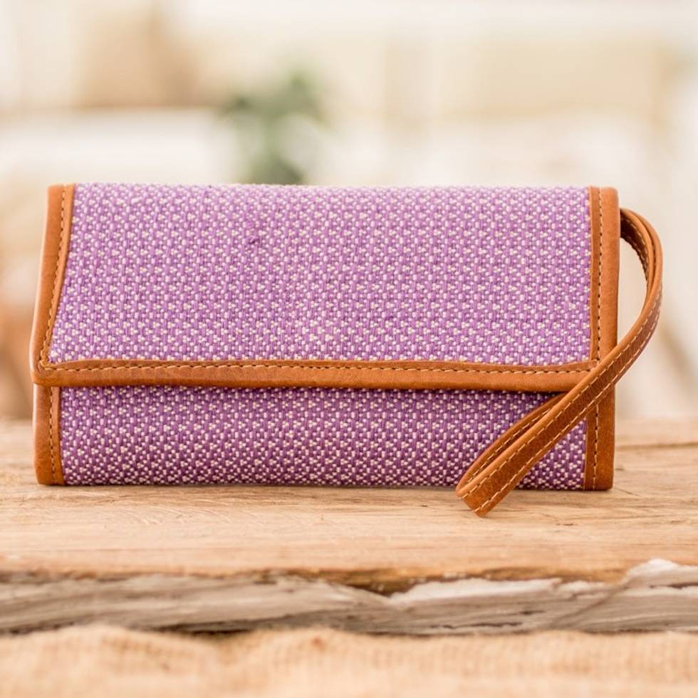Hand-Woven Lilac Cotton Wristlet with Leather Trim and Strap 'Weaving Stories in Lilac' Item ID: 2671769474