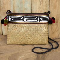 Hand Woven Natural Fiber Shoulder Bag with Thai Pompoms 'Akha Wonder' Item ID: 2669897461
