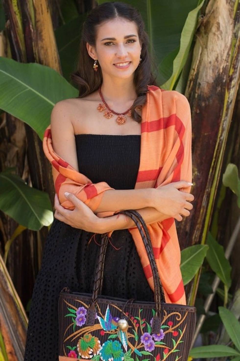 The colors shown in the photo are brighter and of more orange or rust hue than the scarf I received. It is lovely and of beautiful workmanship, but not what I had wanted. However, I've decided to give it as a birthday gift to someone who wears a lot of the maroon that is in the scarf. I have bought scarves from this artist before, and I admire her talent. The color are just not accurate on this one.