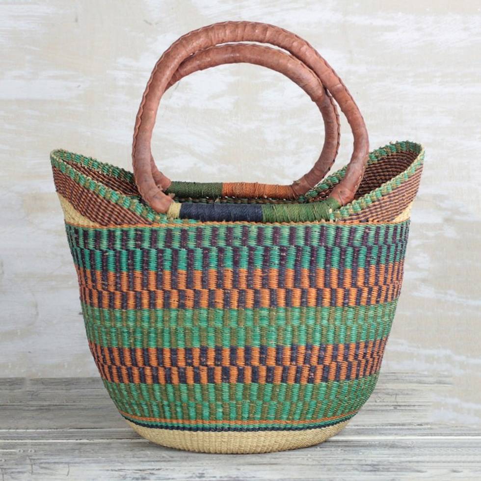 Hand Woven Raffia Natural Fiber Tote with Leather Strap 'Bolga Basket' Item ID: 2671803498