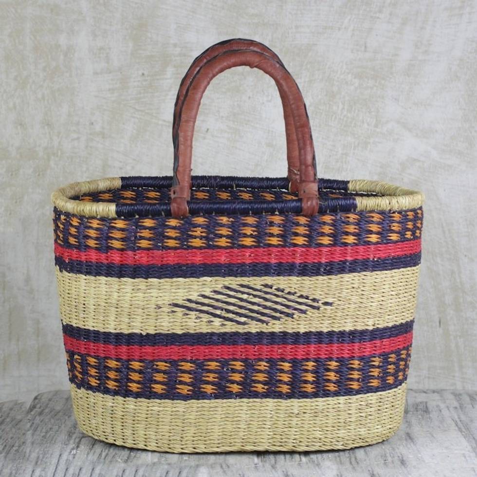 Hand Woven Raffia Natural Fiber Tote with Leather Strap 'Kite Basket' Item ID: 2671803926