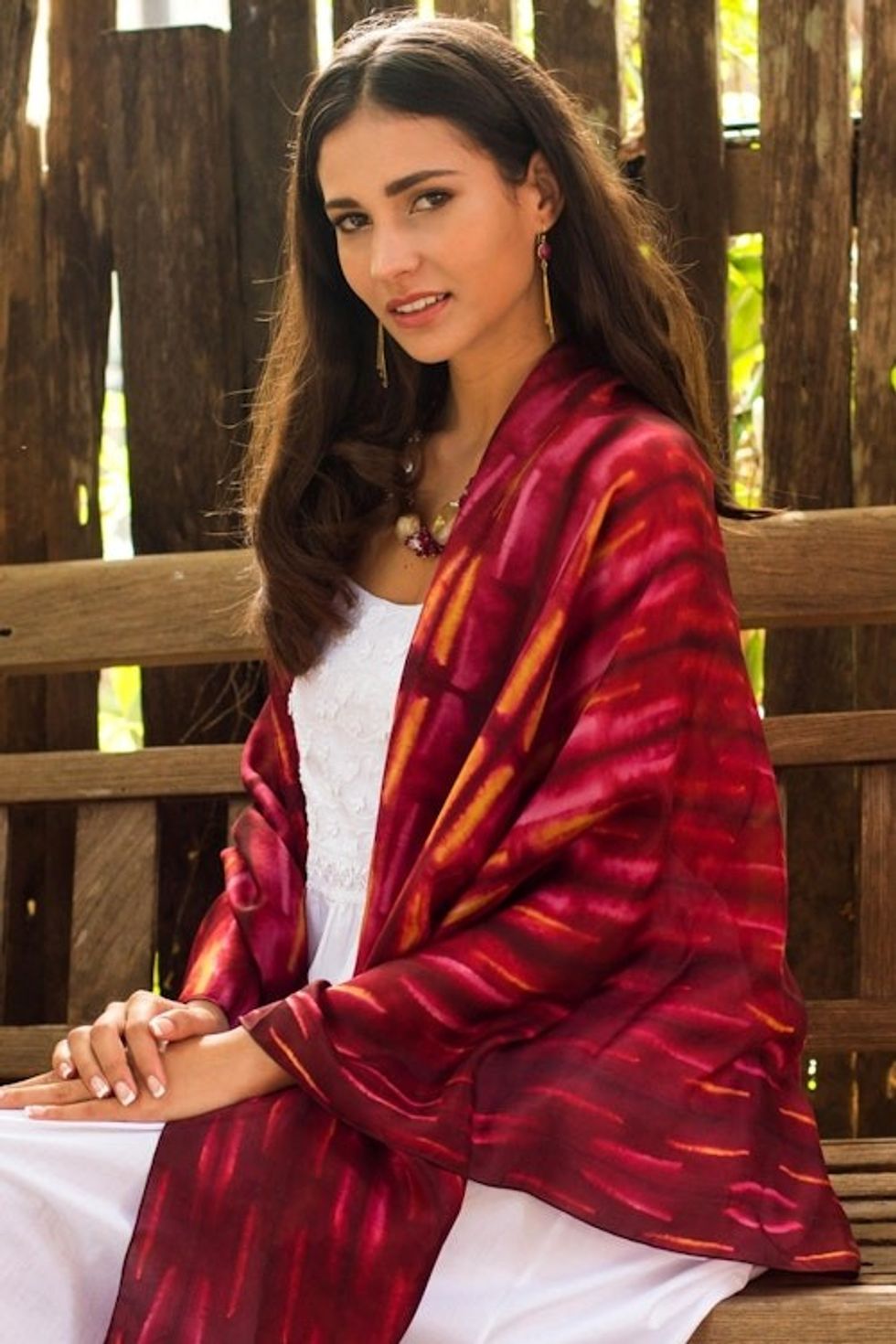 Hand Woven Red Pink and Yellow Tie Dyed Silk Shawl 'Mekong River' Item ID: 2671801971