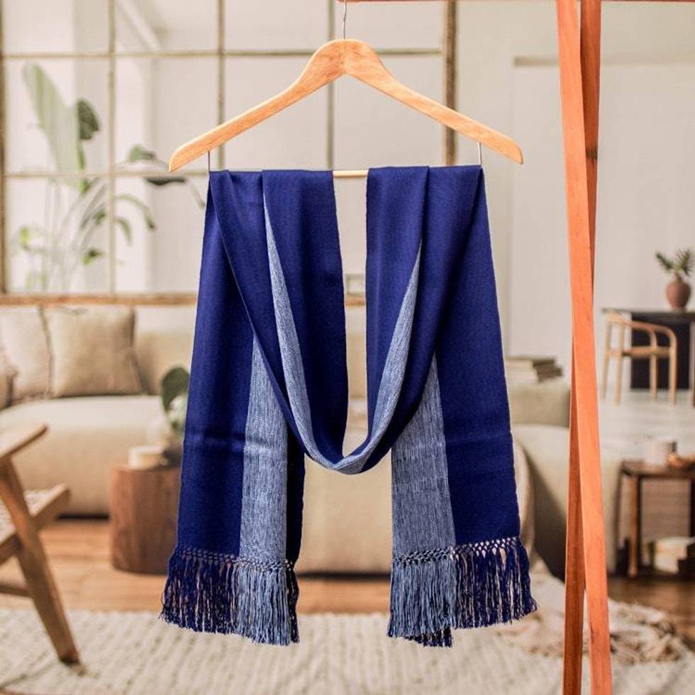 Hand-Woven Striped Fringed Rayon Scarf in Blue Shades 'Dual Elegance' Item ID: 2676659899