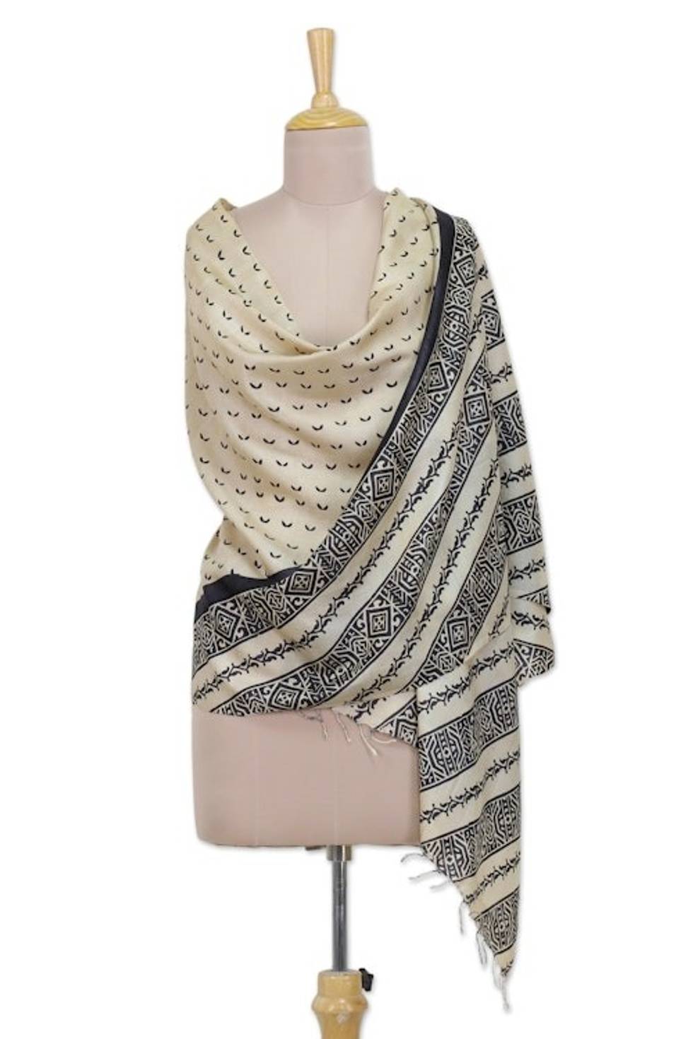 Hand Woven Striped Indian Silk Shawl in Ivory and Coal Black 'Midnight Flock' Item ID: 2669892282