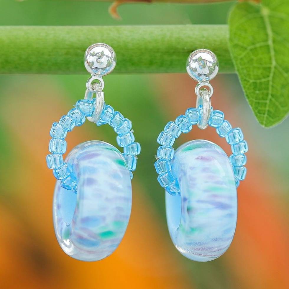 Handblown Glass Beaded Blue Dangle Earrings from Thailand 'Blue Glamor' Item ID: 2671796600