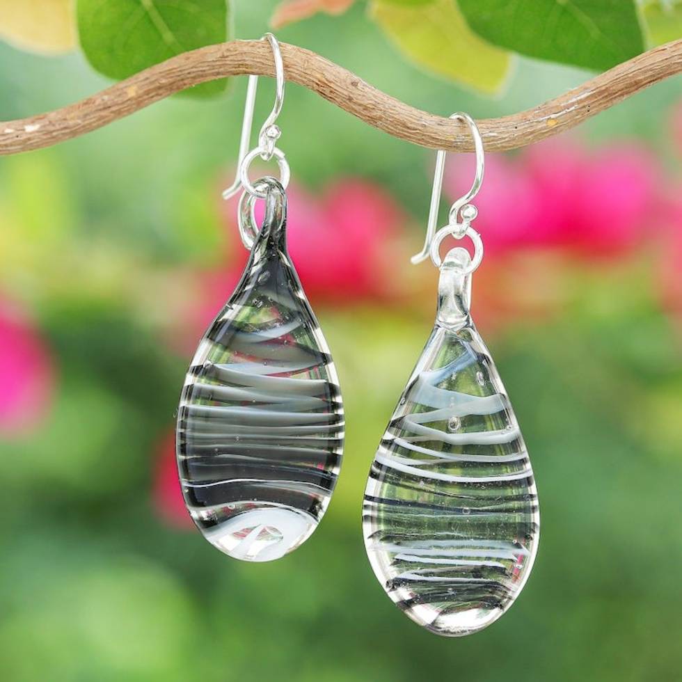 Handblown Glass Dangle Earrings with Black Spirals 'Black Ovate Leaf' Item ID: 2671646395
