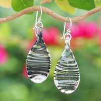 "Majestically handcrafted by Thai artisan Panapai, these stylish dangle earrings take the shape of an elongated leaf. Each piece is meticulously shaped and adorned, employing the esteemed art of handblown glass, which allows black pigments to complement the material's clear look with dapper swirls. Suspended from polished sterling silver hooks, these earrings sway gracefully, adding a touch of timeless beauty to your ensemble."
