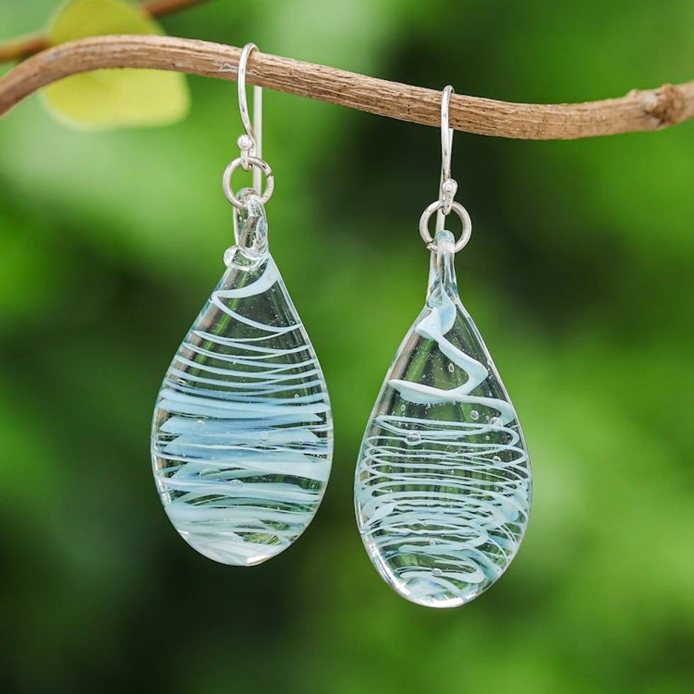 Handblown Glass Dangle Earrings with Blue White Spirals 'Blue Ovate Leaf' Item ID: 2669930677