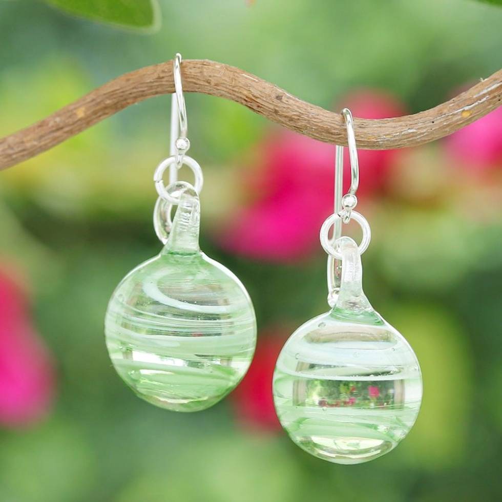 Handblown Glass Dangle Earrings with Green White Spirals 'Green Ball' Item ID: 2671646735