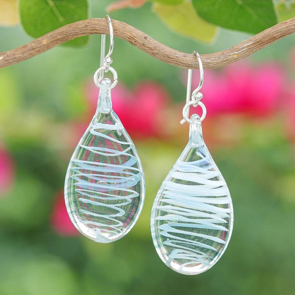 Handblown Glass Dangle Earrings with Light Blue Spirals 'Sky Blue Ovate Leaf' Item ID: 2671646611