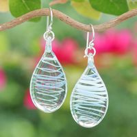 "Beautifully handcrafted by Thai artisan Panapai, these ethereal dangle earrings take the shape of an elongated leaf. Each piece is meticulously shaped and adorned, employing the esteemed art of handblown glass, which allows light blue pigments to complement the material's clear look with serene swirls. Suspended from polished sterling silver hooks, these earrings sway gracefully, adding a touch of timeless beauty to your ensemble."