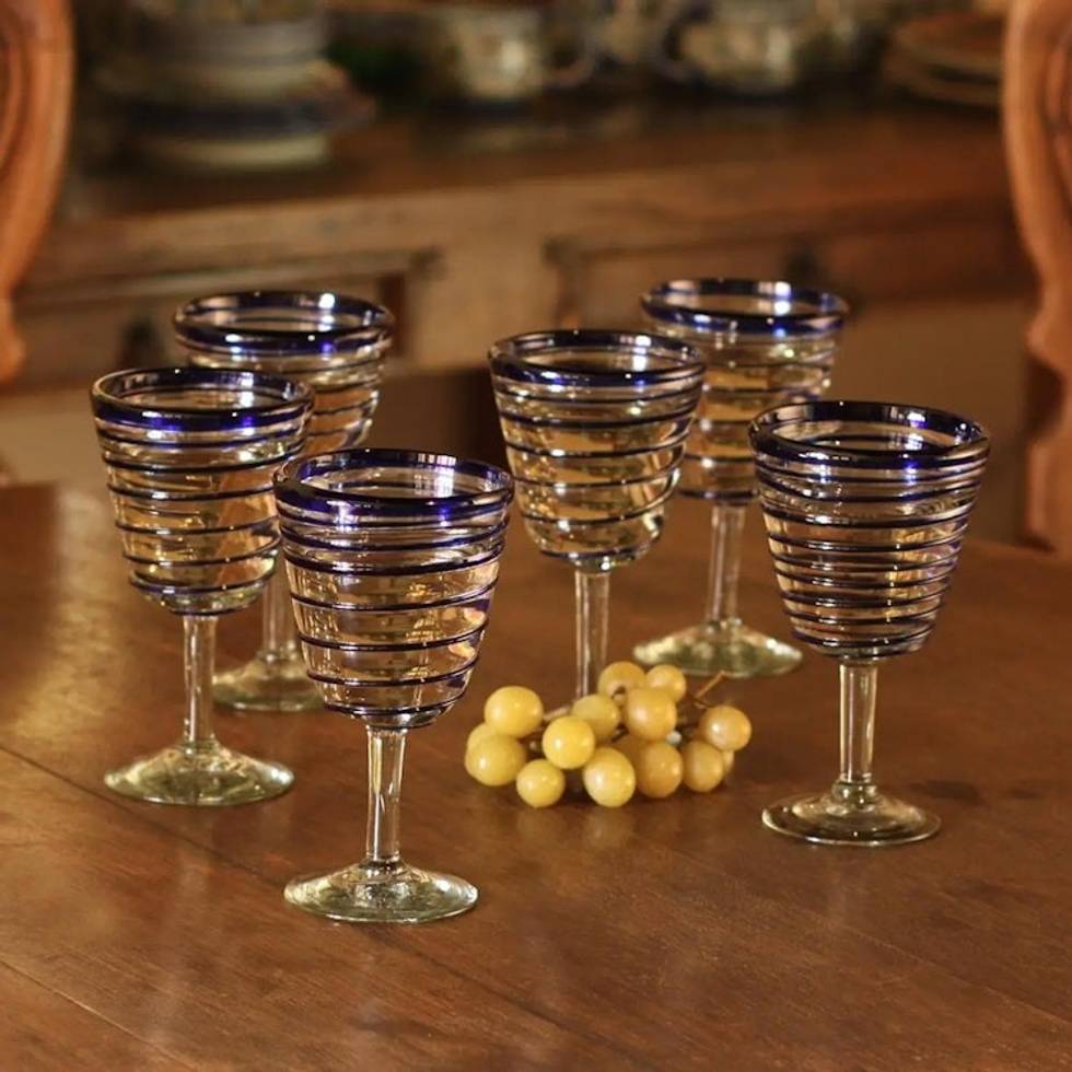 Handblown Recycled Glass Six Striped Blue Wine Glasses 'Cobalt Spirals' Item ID: 2671639045