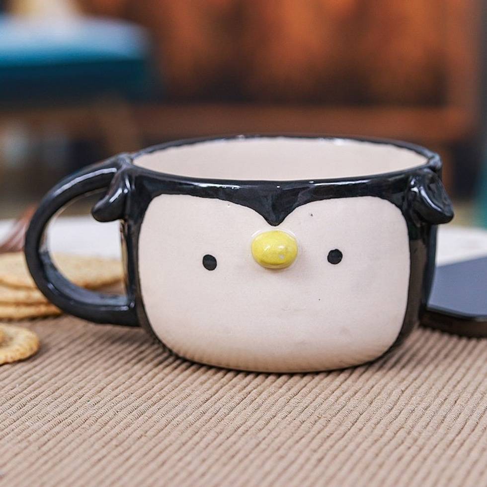 "Transform your coffee routine with Paiboon's whimsical and irresistible penguin cup. This hand-crafted and painted ceramic piece from Thailand brings a splash of fun to your morning ritual with its quirky design and smooth glaze."