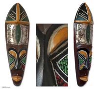 "This bright and colorful mask celebrates the start of the Homowo Festival of Ghana's Ga people. According to custom, long ago people were starving due to a lack of rain and no harvest. Eventually the rains returned and Homowo (from homo meaning hunger, and wo meaning sleep) celebrates the end of the draught. The mask also celebrates the births of twins, believed to augur good fortunes. Sefah Mohammed honors this legendary tradition with a sese wood replica painted black, green and yellow. It is adorned with embossed aluminum plates and glistening glass beads. Clay is used to give the mask an antique appearance."