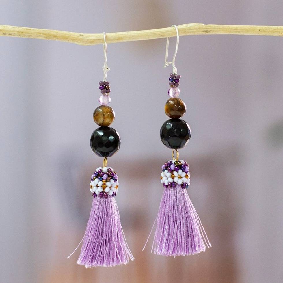 Handcrafted Agate Tigers Eye Beaded Purple Tassel Earrings 'Playful Purple' Item ID: 2671808092