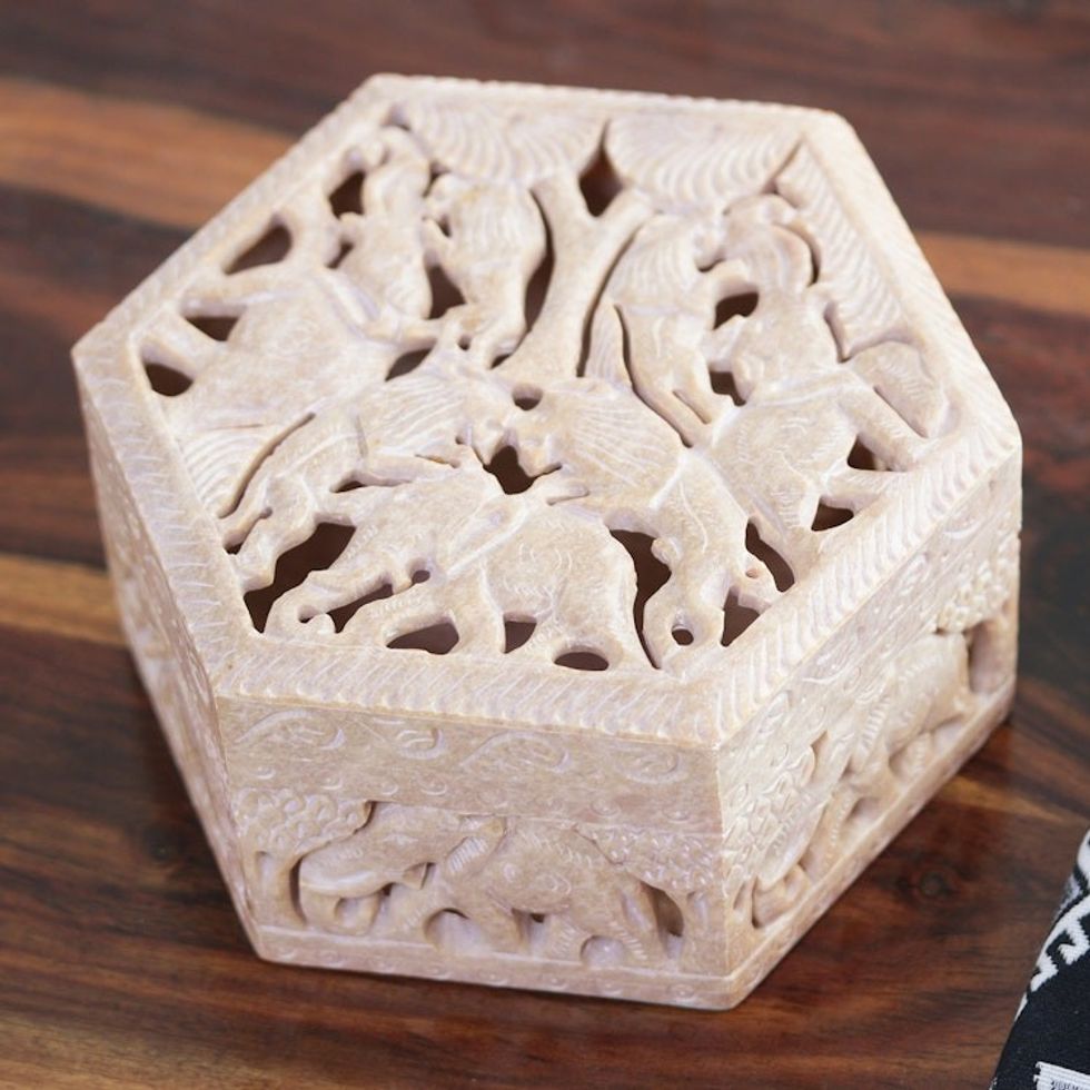 Handcrafted Animal Motif Soapstone Jewelry Box from India 'Jungle Unity' Item ID: 2671788423