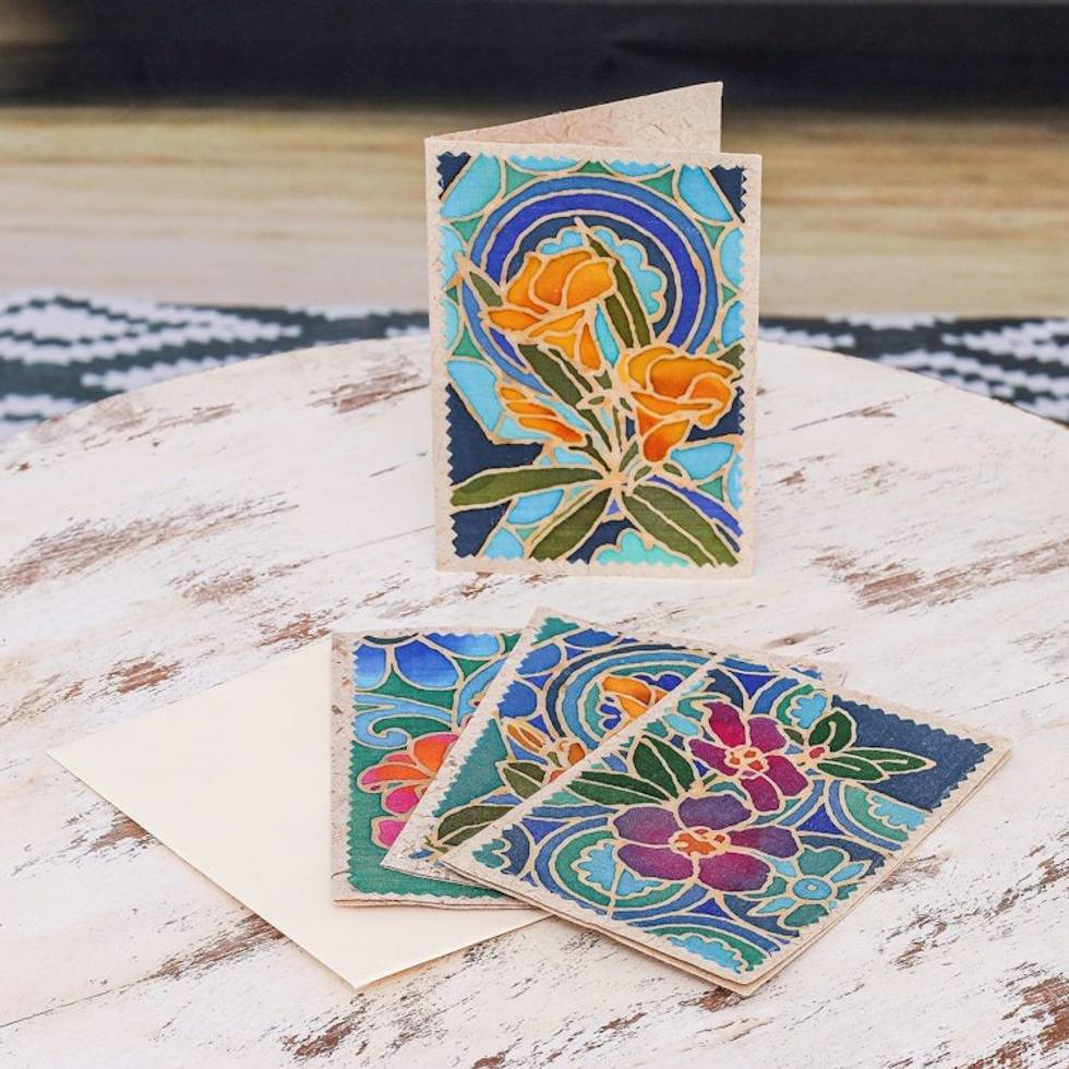 Handcrafted Batik Cotton and Paper Greeting Cards Set of 4 'Thai Paradise' Item ID: 2671641008