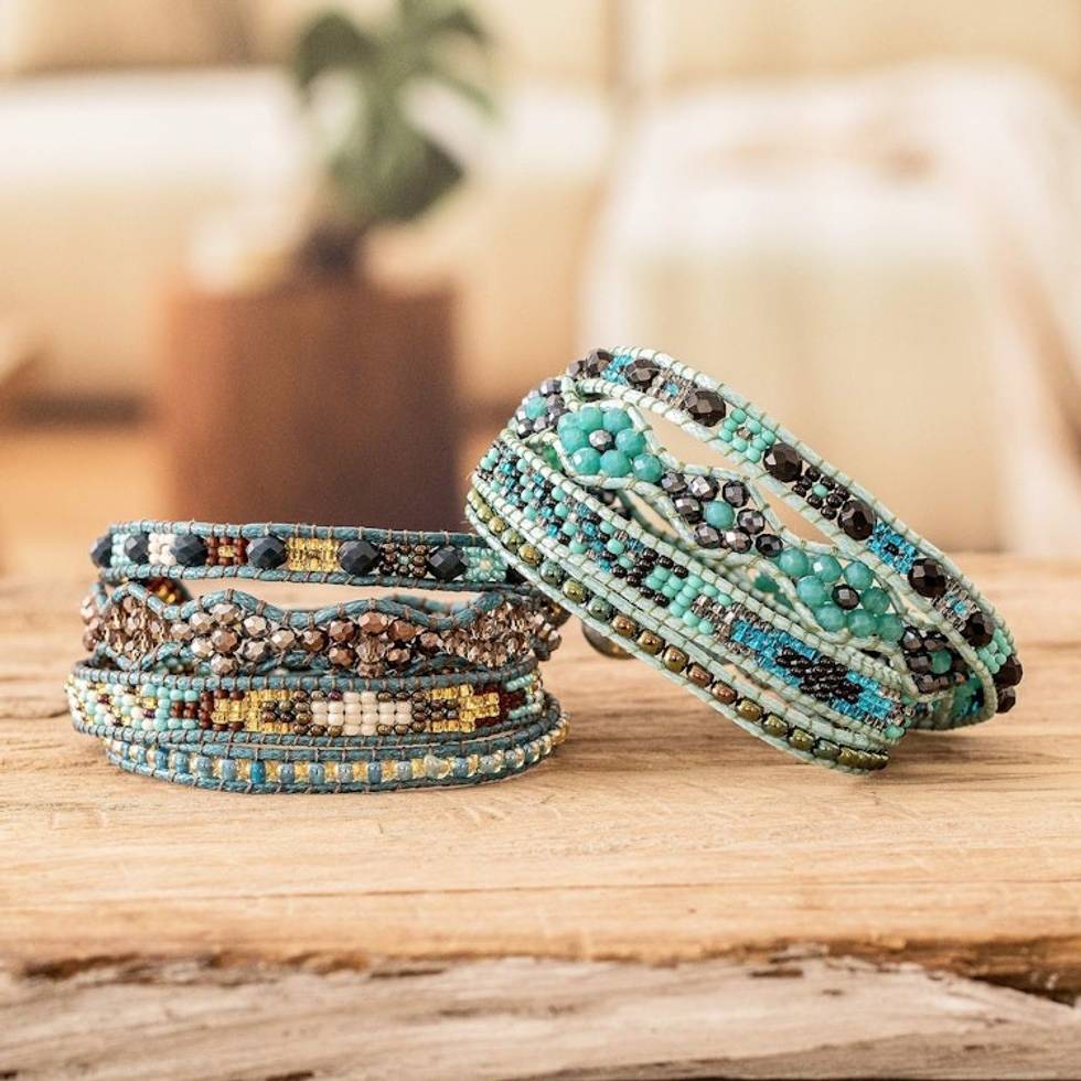 Striking wrap bracelet. The colors are lovely and catch the light well. Lightweight to wear and goes with a variety of my outfits.