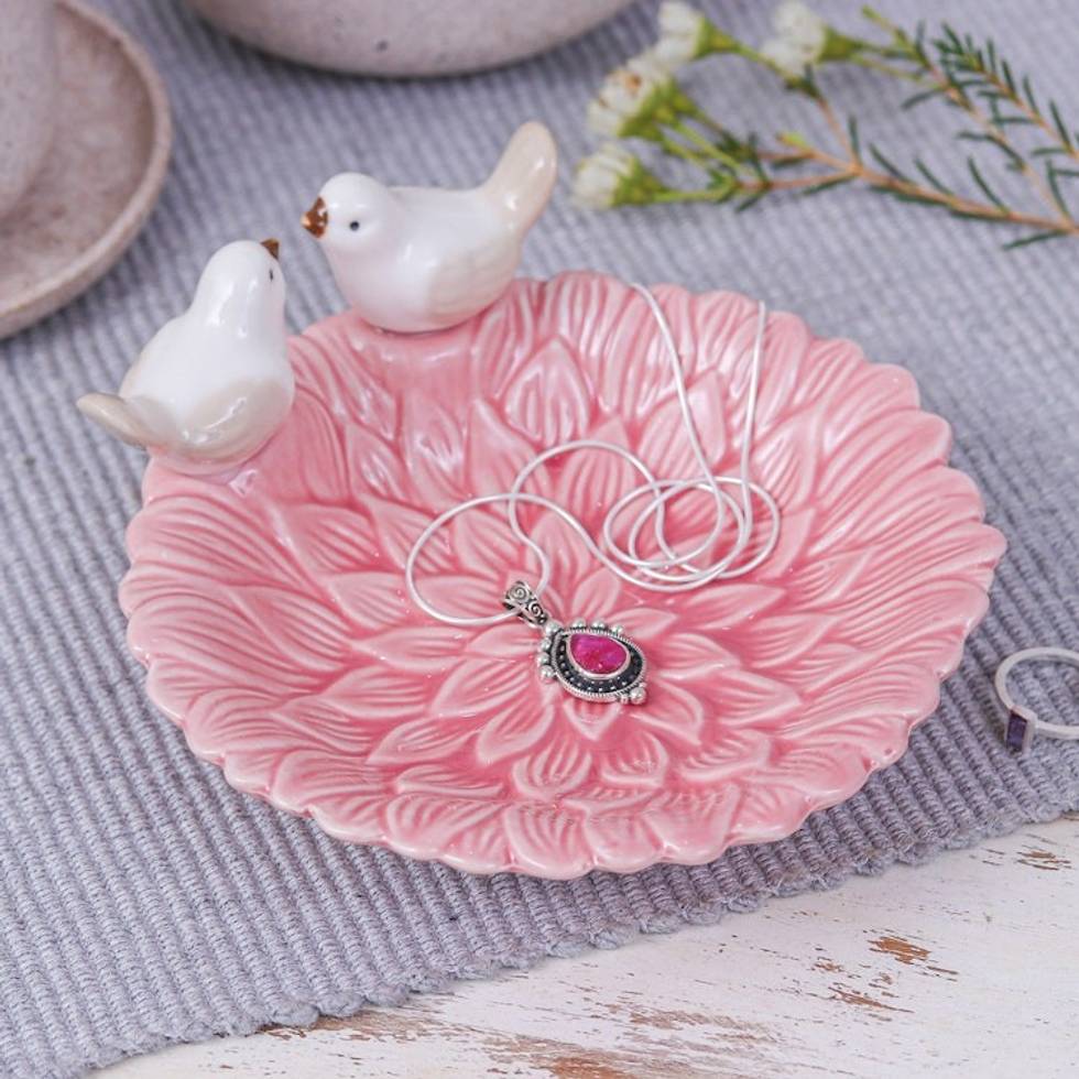 Handcrafted Bird-Themed Floral Pink Ceramic Catchall 'Sweet Birds' Item ID: 2671651985