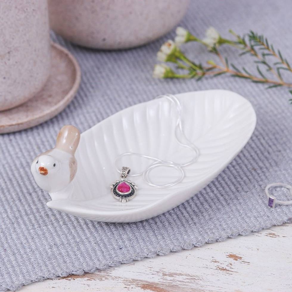 Handcrafted Bird-Themed Leaf-Shaped White Ceramic Catchall 'Chants of Peace' Item ID: 2671796845