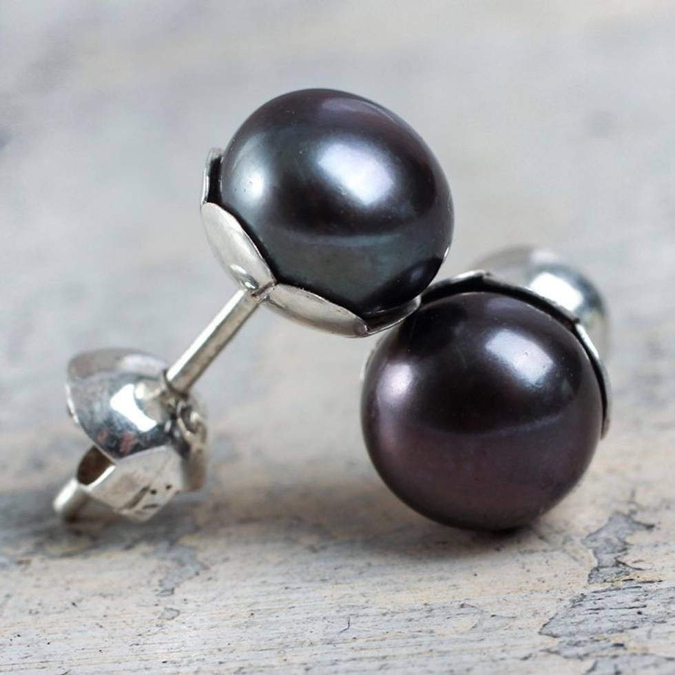 Handcrafted Black Cultured Pearl Stud Earrings 'Black Nascent Flower' Item ID: 2669919630
